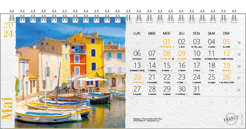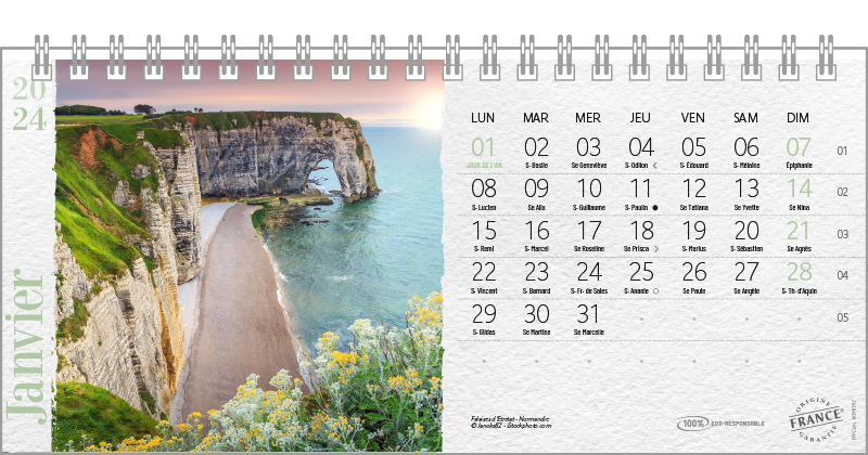 Chevalet peintures et paysages: 12 feuillets Support: carte couchée 400g Bloc: 13 ou 14 feuillets imprimés recto/verso papier satiné 275 gr Reliure: spirale blanche Grille: mensuelle Marquage: version 13 feuillets; marquage en dorure à chaud sur les 2 faces du support Version de 14 feuillets; marquage en offset 1 couleur sur un 14e feuillet Format support 14cm x 19.7cm Quantité: 50/99 100/199 200/299 300/399 400/499 500/749 750/999 1000 et + 1 coul. 10.78€ht 7.69€ht 6.93€ht 6.70€ht 6.63€ht 6.37€ht 6.28€ht 6.06€ht Frais techniques: 1er maquette gratuite (si modification maquette 25€ HT) Ref CY01