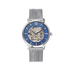 Boîtier acier homme 39 mm Mouvement automatique Squelette Miyota 8N24 Cadran argent ou bleu Verre minéral Bracelet cuir véritable noir, marron ou bleu avec broderie tricolore Bracelet milanais argent Bracelets interchangeables Etanche 5 ATM Coffret grand luxe MIF Quantité: 10 à 24 25 à 99 100 et + Prix: 149.00€ ht 132.00€ ht 119.90€ ht