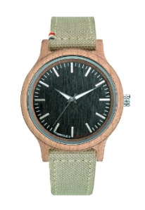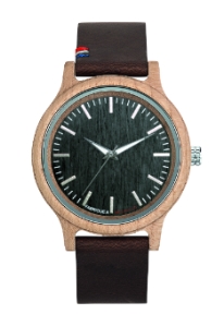 Chailluz (modèle bois) Boîtier en bois d'érable 15 mm Mouvement Citizen 2035 Cadran finition bois clair ou bois fonçé Verre minéral Bracelet cuir véritable noir, marron et tissu beige avec broderie tricolore Bracelets interchangeable Ecrin luxe Quantité: 25 à 99 100 à 249 250 et + Prix: 48.90€ht 45.80€ht 39.90€ht