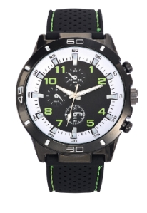 Boîtier métal laqué noir 40 mm Mouvement Citizen 2035 Cadran et index assortis Bracelet silicone semi perforé avec surpiqûres assorties Coloris noir, gris et rouge Poussoire et petit compteur imitation chrono Etanche 5 ATM Dimensions de marquage 6,5 mm Ecrin boîte ronde métal Quantité: 25 à 99 100 à 249 250 et + Prix: 21.60€ht 19.60€ht 17.90€ht