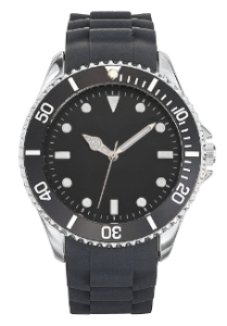 Boîtier plastique noir 44 mm Lunette tournante Mouvement chrono japonais VD53 Cadran noir avec compteur Bracelet soft touch Etanche 5 ATM Dimensions de marquage: 9 mm Ecrin boîte plastique ronde Quantité: 25 à 99 100 à 249 250 et + Prix: 49.60€ht 45.40€ht 41.90€ht