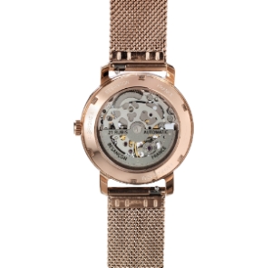 Boîtier acier doré rose dame 35 mm Mouvement automatique Squelette Miyota 8N24 Cadran argent Verre minéral Bracelet cuir véritable noir avec broderie tricolore Bracelet milanais argent ou doré rose Bracelets interchangeables Etanche 5 ATM Coffret grand luxe MIF Quantité: 10 à 24 25 à 99 100 et + Prix: 149.00€ ht 132.00€ ht 119.00€ ht