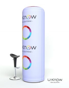 Colonne gonflable à air captif. Une valve est positionnée sur le bas pour gonflage, regonflage d'appoint et dégonflage de la colonne. Visuel imprimé en sublimation sur toile polyester en all-over ,communication à 360° Tailles (cm): 72 (L) x 72 (l) x 280 (h)